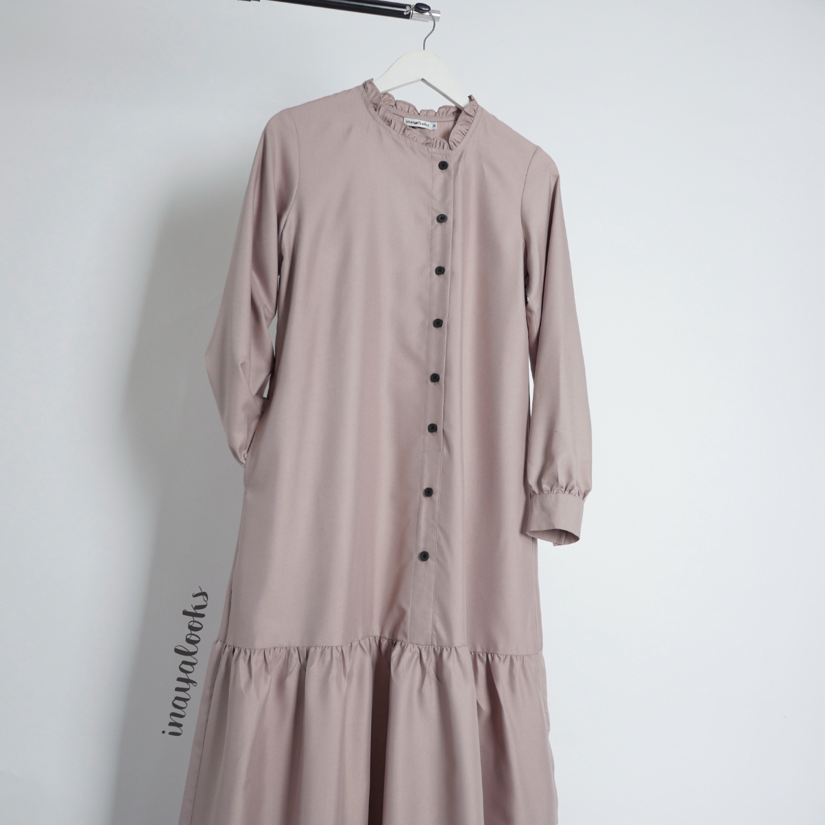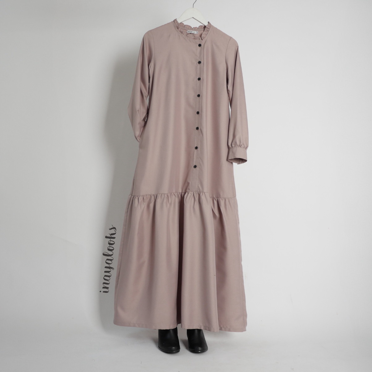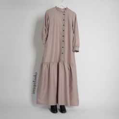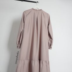 Gamis dari bahan katun toyobo warna coklat susu dengan model sambungan kerutan bawah depan dan belakang.
